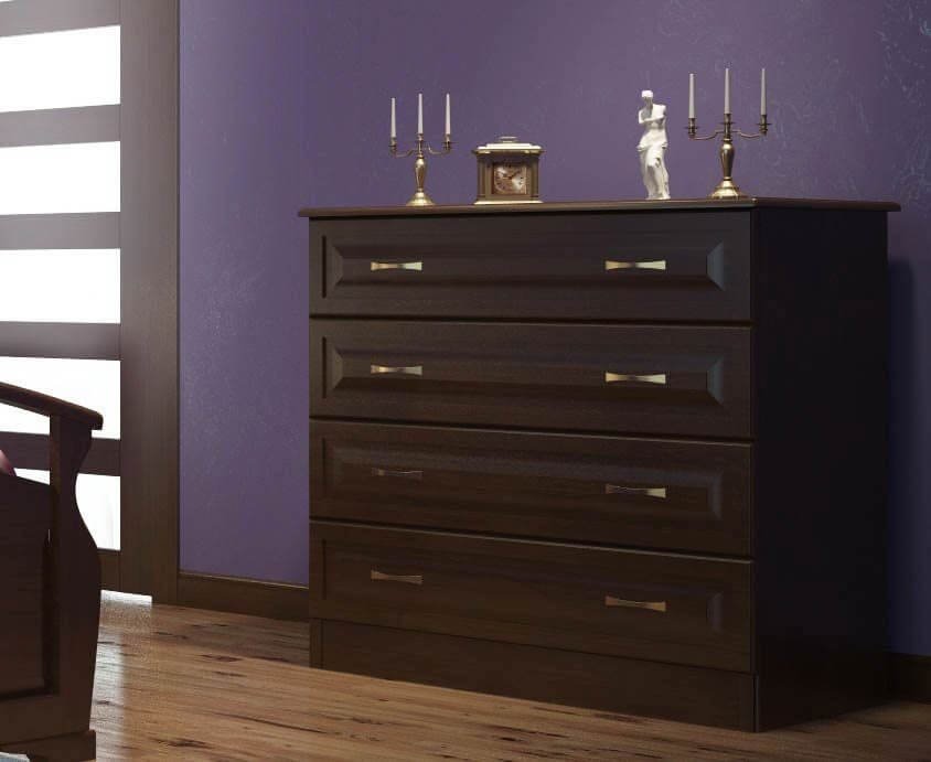 На выбор предлагаются актуальные цвета древесины, в том числе оттенки орех и груша. Купить изделия возможно в стандартной и индивидуальной комплектации. Под заказ изготавливаются комоды с другими параметрами по высоте, с дополнительным ящичком и автодоводчиками закрытия, что несущественно сказывается на цене.