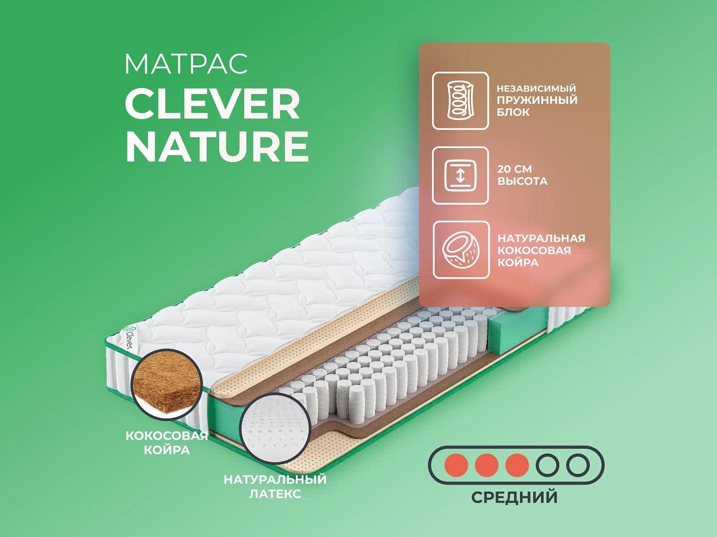 Фабрика Clever получила заслуженную репутацию, благодаря применению новых технологий и безупречному соблюдению стандартов качества. Clever Nature — образец продукта с лучшими характеристиками и доступной ценой, матрас создан из дышащих тканей, с эффектом вентиляции.