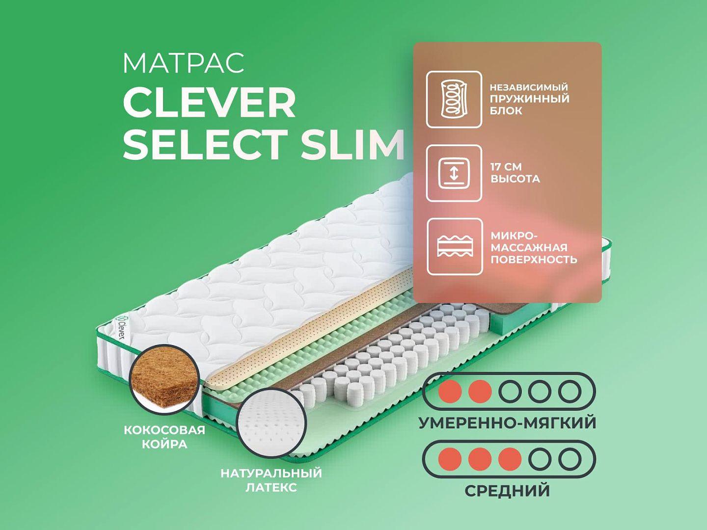 Фабрика Clever получила заслуженную репутацию, благодаря применению новых технологий и безупречному соблюдению стандартов качества. Clever Select Slim — образец продукта с лучшими характеристиками и доступной ценой, матрас создан из дышащих тканей, с эффектом вентиляции.