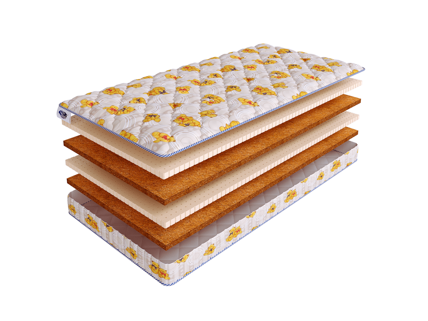 Чехол матраса выполнен их поликоттона с детским рисунком и простеган на гипоаллергенном волокне.